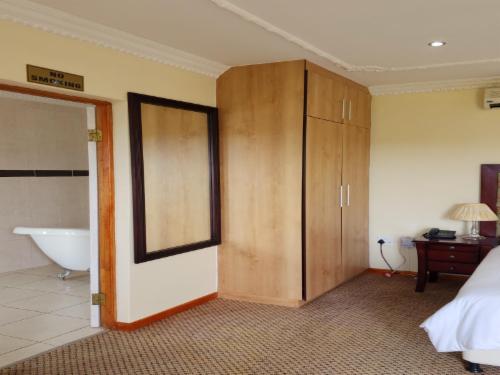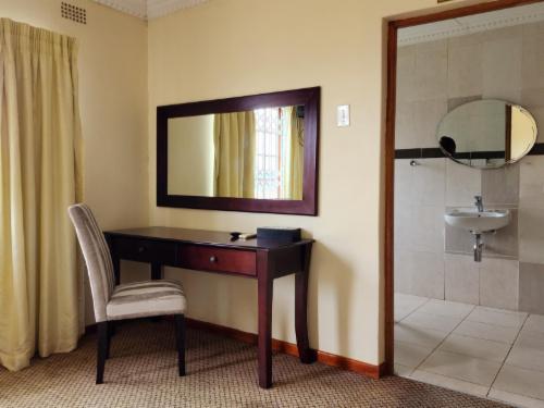 Inside, you’ll find everything you need for a productive and relaxing stay: a flat-screen TV with DStv for your entertainment, a well-lit work desk for business or planning your adventures, a convenient bar fridge, and tea and coffee-making facilities for those quiet moments. Complimentary high-speed Wi-Fi keeps you connected throughout your stay.